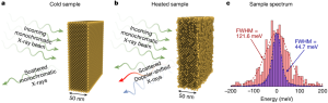A thin (50 nm) gold foil is probed with a monochromatic X-ray beam. When the sample is cold (a), the scattered X-rays remain monochromatic and have a narrow spectrum. After an ultrafast heating pulse (b), the vibrating atoms Doppler shift the scattered X-rays and broaden their energy distribution (c). The increase in spectral width (red and blue) reveals the extreme ionic temperatures inside the still solid crystal. Reprinted from TG White et al., “Superheating of gold beyond a predicted entropic catastrophe threshold,” Nature (2025), s41586-025-09253-y