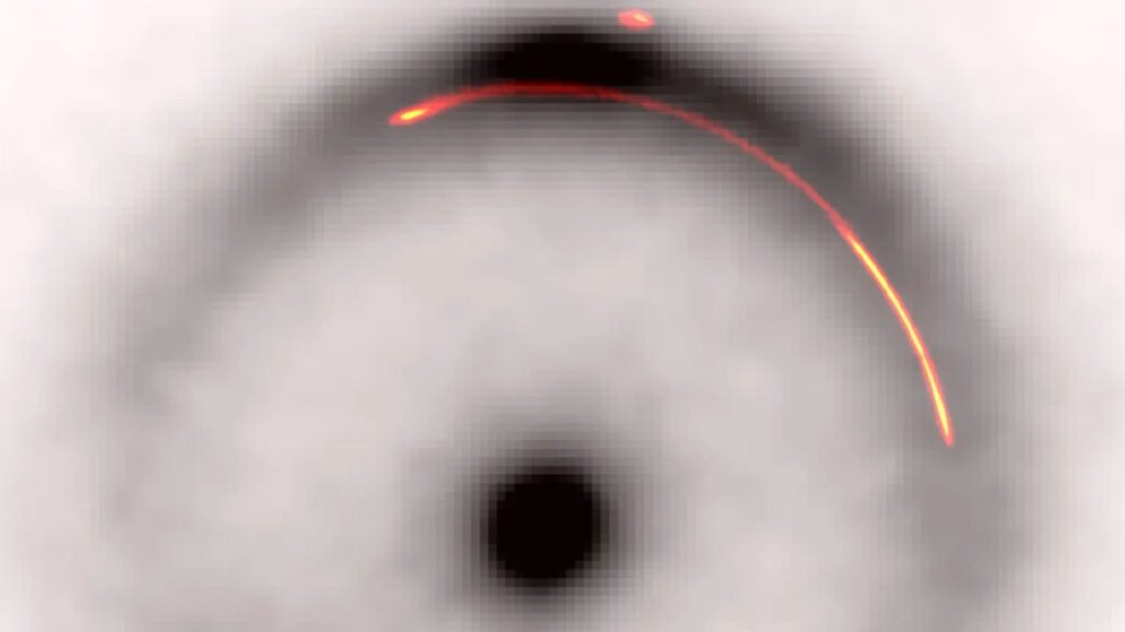 B1938+666 was discovered in the 1990s. But in two new studies published October 9 in the journals Nature Astronomy and Monthly Notices of the Royal Astronomical Society, researchers took a closer look at objects affected by gravitational lensing and found subtle wobbles in the pronounced arc of radio waves in the outer ring (colored red and yellow in the image). They quickly realized that this was a gravitational disturbance caused by a hidden object.
