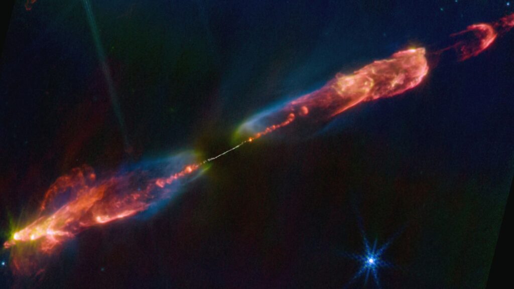 In this spectacular image, a colorful display of a bipolar jet is captured in near-infrared wavelengths by the James Webb Space Telescope (JWST). However, JWST’s view is obscured by thick dust surrounding the central area.