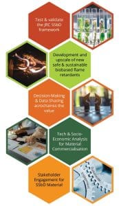 A central pillar of this project is the implementation of the SSbD framework by the EU Joint Research Center. BIOSAFIRE uses an iterative, step-by-step approach to integrate SSbD principles into early conceptual design. In addition to technological innovation, BISOAFIRE also incorporates a social sciences and humanities (SSH) perspective to strengthen societal acceptance, while providing training materials to support the introduction of sustainable flame retardant solutions into industry.