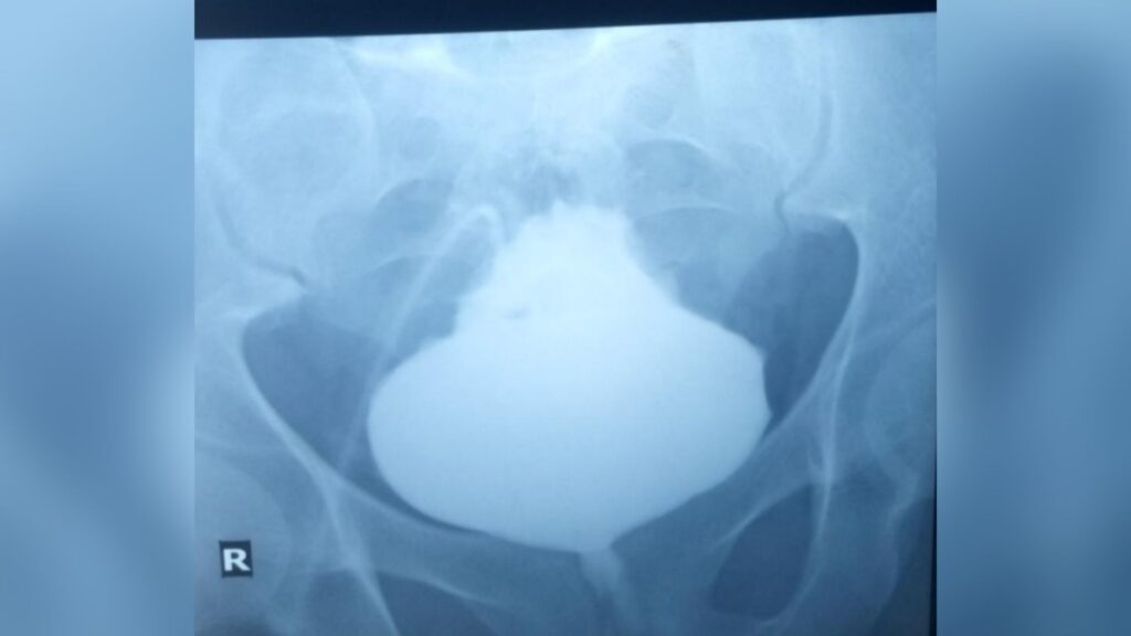 X-rays confirmed that urine was blocked from leaving the organ. However, a detailed examination of the bladder revealed that there was no problem with the organ itself, such as an obstructive mass or a bladder stone. This led doctors to think that the obstruction might be elsewhere.