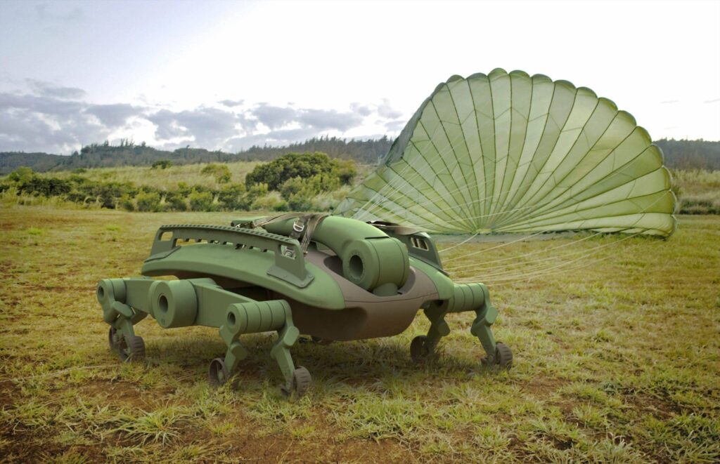 Mounted on top of the robot chassis is a modular cargo platform designed for flexibility. The system can be configured for a variety of roles, from serving as a drone launch and refueling station to transporting equipment, tools, and emergency supplies.