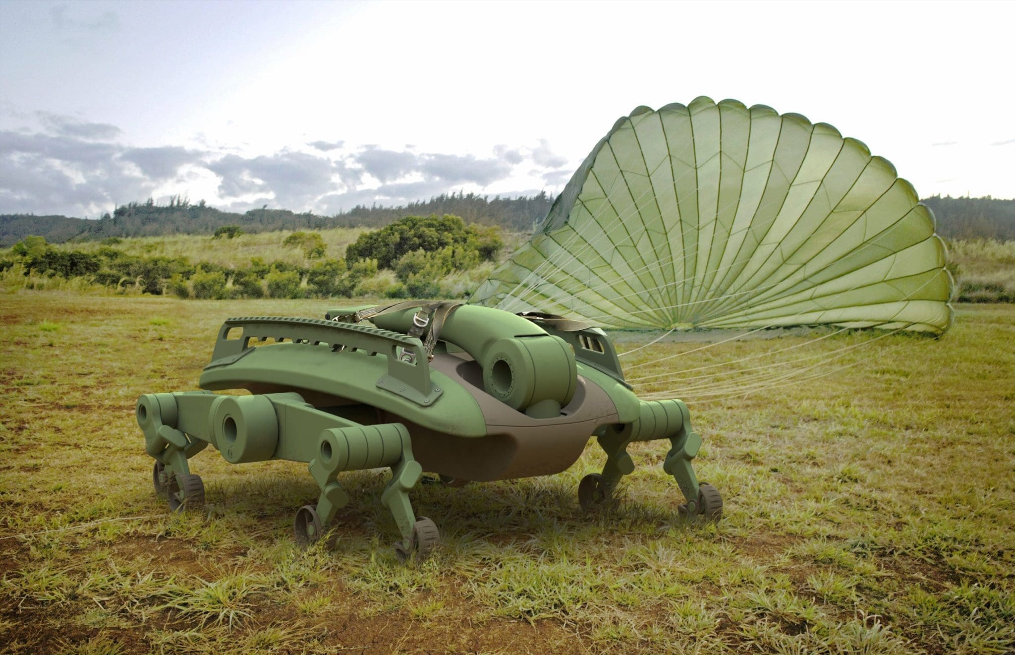 This platform is built on a modular chassis designed to operate in a variety of terrains. The main feature is eight articulated semi-robotic legs with integrated wheel assemblies.