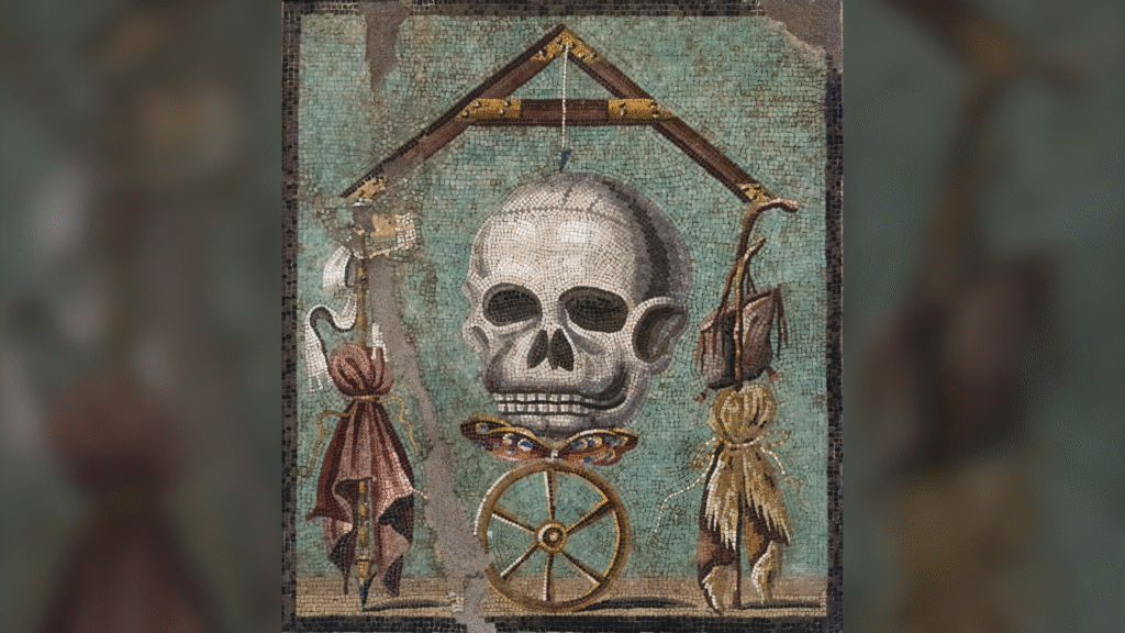 According to the National Archaeological Museum of Naples, which owns the mosaic, above the skull is a spirit level with a wire supporting a hanging plumb bob, a tool used to ensure that construction is level or vertical. A colorful butterfly perches under the skull, perhaps a metaphor for the soul. Below it is a wheel, probably symbolizing good luck. The sides of the skull tied to the edge of the level have a scepter and purple cloak on the left, and a beggar’s staff and saddlebags on the right. This juxtaposition suggests a perfect balance between power and wealth on the one hand and poverty on the other.