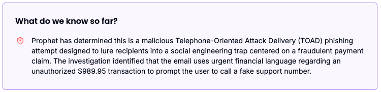 By identifying mismatches between the sender (Zoom) and the content (PayPal’s financial urgency), Prophet AI was able to identify a trap as an actual attack before any financial loss was incurred.