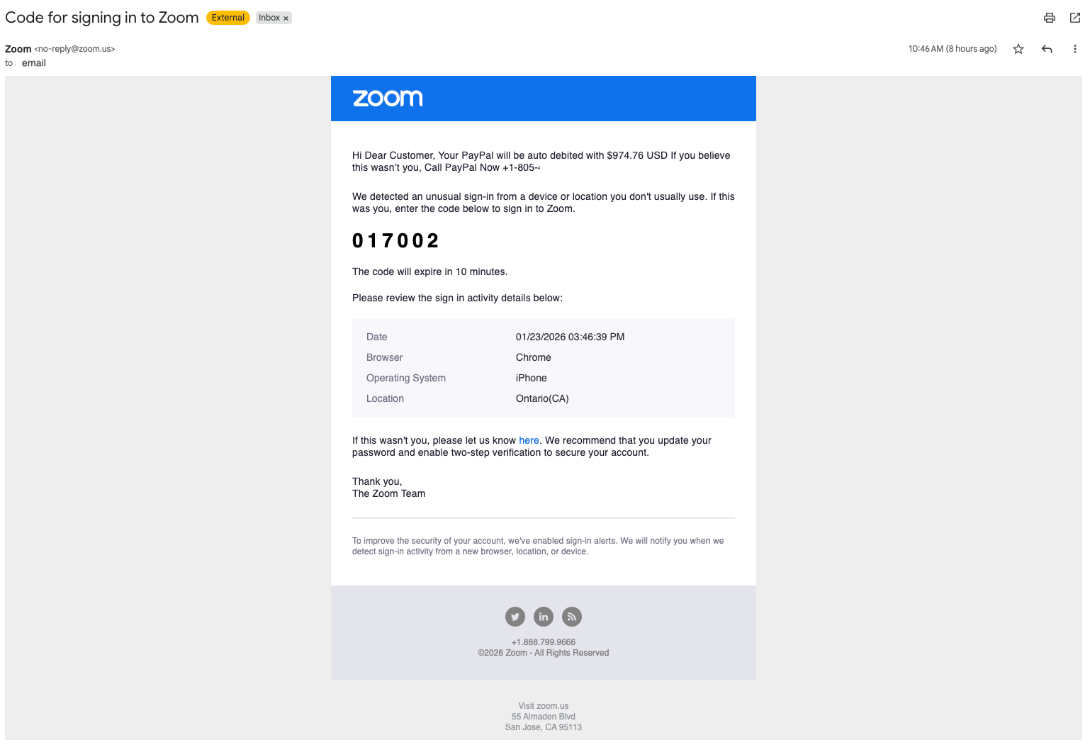 “Dear Customer, $989.95 USD will be automatically debited from PayPal. If you believe you are not who you say you are, please call PayPal now at +1-805-400-XXXX.” Trigger and Delivery: The attacker sets up an email account to automatically forward the message to the victim. You will then attempt to log into your Zoom account and Zoom will send you a standard one-time password (OTP) email.