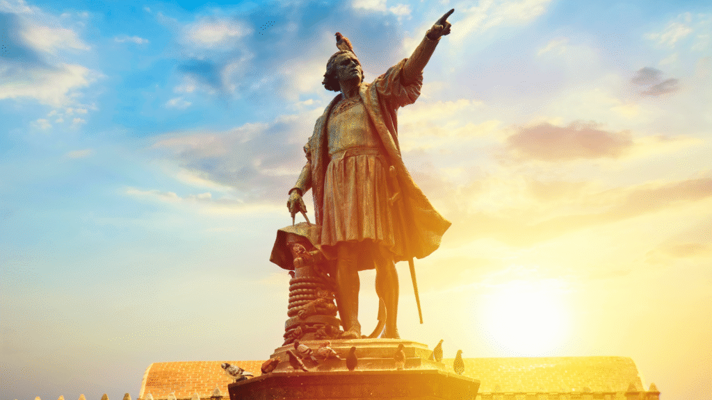 Statue of two men from the Age of Discovery. One person has a sword. Behind the statue is a field and some buildings.